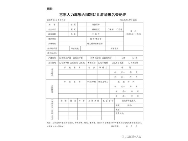為滿足我市公辦幼兒園師資需求,我公司面向社會公開招聘一大批非事業(yè)編合同制幼兒教師,以勞務(wù)派遣的方式與用人單位進(jìn)行勞動力資源開發(fā)合作。現(xiàn)將有關(guān)事項公告如下:一、招聘人數(shù)及崗位我市招聘非事業(yè)編合同制幼兒教師50名,具體崗位在選崗前公示。二、招聘方式通過第三方勞務(wù)公...